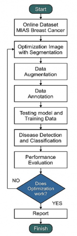 Figure 1 provides information on the working principle of the approach proposed in this study. The working principle consists of eight stages. The first stage of the online MIAS breast cancer dataset is determining and collecting breast cancer image data from online datasets. The second stage is preprocessing by optimizing the image data. The optimization uses a segmentation technique or algorithm according to the needs and functions. Optimization plays a role in increasing the value of object detection accuracy by manipulating the image. These manipulations include size, resolution, colour enhancement, and more.