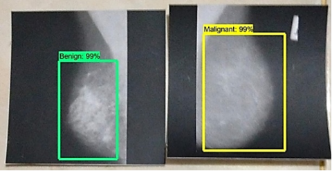 This stage describes system testing results from CNN and Faster R-CNN models for detecting image data classification. The process of testing the proposed approach system in this study through a smartphone camera in real-time. System testing at this stage uses the results of training data scenario1. The following are the results of the detection and system classification of breast cancer images, as shown in Figure 7.