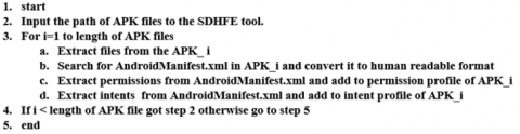 Permissions and intent filters are important features in the Android manifest file that govern access to devise resources and define how the application interacts with other components. However, these features are susceptible to exploitation by malicious applications. For instance, the android. permission.SEND_SMS permission is commonly utilized in benign applications for sending and receiving SMS messages, it can be maliciously employed to send unauthorized premium-rate messages or utilized in phishing attacks, where deceptive SMS messages containing malicious links or requests for sensitive information are sent. Another exploit involves a malicious app registering itself to receive the "android.intent.action.PHONE_STATE" intent, enabling it to eavesdrop on phone conversations. This unauthorized access grants the app the ability to obtain call-related information, such as phone numbers, call durations, and even the audio content of the calls. Figure 4 illustrates the pseudocode algorithm for extracting permissions and intents, as well as generating profiles for applications by the SDHFE tool.