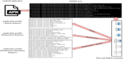 Many researchers have developed and implemented their own tools for extracting features from Android apps. In 2019, Kapoor et al. [10] presented a method for the classification of Android applications based on permissions. The proposed system collects data from many sources. Benign samples are collected from the Google Play store while the malware samples are collected from different websites like virus share and zeltser. They have developed a Python script to extract static features (permissions) and save them in a CSV file. In 2020, Bibi et al. [11] proposed a deep learning model based on Gated Recurrent Unit GRU for the detection of malicious applications in the Android system. The proposed model can classify applications into benign, backdoor, and Trojans. The authors collected samples from AMD and Androzoo datasets. A Python script was developed to extract useful information and generate feature vectors from a manifest file. The developed script thoroughly analyses the manifest file and extracts many features like permissions, API calls, and intents. In 2020, Sirisha et al. [12] suggested a sequential neural network model in order to predict the presence of malware in Android APK files received from the web or play store. The dataset consisting of 398 APK files having 331 features was used for training the model in the proposed model. During the test, the neural network model will be tested using data from the Android play store as well as malicious sites, such as Droidbench, which includes malicious and benign APK files. The permissions were extracted from the APK file by using the Androguard tool. In 2019, Hr [13] developed a fully connected deep-learning model for detecting malicious applications. Benign data samples are collected from the Google Play store, while the malware samples are collected from the virus share repository. The Androguard tool was used for analyzing APK files to extract permissions from the application, and the random forest was used for feature selection. In 2018, Koli [14], presented the RanDroid method that uses several machine learning algorithms like random forest, naive Bayes, support vector machine, and decision tree for classifying malware applications. The RanDroid method depends on many features, such as API calls and requested permissions, along with other application features such as reflection and native code. The researchers used the Androguard static analysis tool to extract features like permissions and API calls. In 2020, Alsoghyer and Almomani [15] presented a model that deeply analyzed the extracted permissions that enabled them to differentiate ransomware from benign applications on the Android device. The important permissions are used and are comparable between ransomware and benign applications. The presented study takes a proactive approach to identifying ransomware before damaging the device. The present work used the APK tool to decompile APK files and then extract features. In 2018, Zhao et al. [16] suggested a deep neural network-based mobile Android malware detection system that employs optimized deep neural networks to learn from opcode sequences to detect malicious code. With the proposed method, the optimized CNN was trained several times on the operation code (Opcode) sequence extracted from the Android app after the de-compilation process by the APK tool. Opcodes represent specific instructions that the Android runtime executes to perform various tasks within the app. The suggested model collected data from many sources, such as Drebin for malicious applications and many Chinese app markets for benign applications. In 2019, Ma et al. [17] presented an ensemble model that detects malware applications based on the machine learning algorithms. The proposed model constructs a control flow graph from the source code after the application is de-compiled by using the flowdroid framework, then extracts API calls from the control flow graph and builds three datasets. In 2022, Kumar et al. [18] introduces a methodology for malware detection in Android applications by extracting features such as permissions, intent filters, activities, and services from the manifest file. The androguard utility is employed to disassemble the code and identify suspicious API calls from the dex code. To improve retrieval efficiency, the extracted features are serialized in feather data format. Finally, the XGBoost algorithm is utilized for effective malware detection.