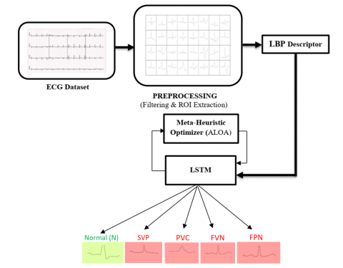 The first phase describes the ECG standard dataset. The second is the preprocessing phase, which focuses on improving image quality, extracting and resizing the region of interest. The third stage involves features extraction using the LBP algorithm to generate ECG signatures. These serve as input vectors to train the LSTM-based model which combined with a meta-heuristic algorithm to optimize its convergence and improve its performance. Finally, various tests will be carried out in order to categorize the diseases classes and perform the proposed system using various metrics.
