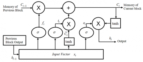where, ht: Output of the current layer, ht-1: Denotes output of the previous layer, xt: is the current input, Ct: Denotes the cell state of the current layer, Ct-1: Denotes the cell state of the previous layer, ft: Denotes the forget gate layer, $\tilde{C}_t$: Denotes the candidate vector.