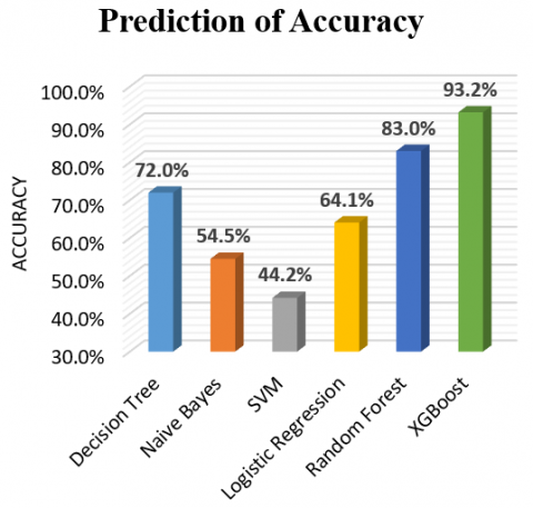 The Figure 6 has considered best prediction accuracy of each model and it clearly shows that XGBoost is outperformed other models such as DT, SVM, NB, LR, and RF.