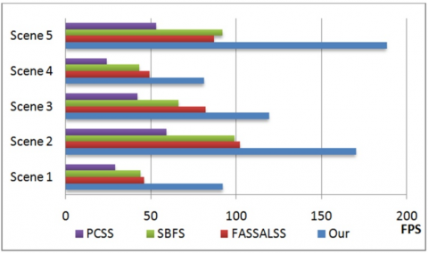 In regard to Figure 9, we use the SSIM measure to validate the precision of our advanced technique for exceedingly complex scenes (see Figure 10). The images on the left portray intricate scenes in the sequence: ground truth with 256 samples, our technique with 16, 9, and 4 samples, and methods proposed by FASSALSS [7], SBFS [6], and PCSS [9] utilizing 16 samples. A comparison of SSIM values demonstrates that our strategy produces values that are closer to unity than the other approaches [6, 9]. Figure 11 depicts an evaluation of the frames per second (FPS) achieved by our technique in comparison to other methods. As a result, our technique produces more accurate images, and our results show that our suggested algorithm is both faster and more accurate.