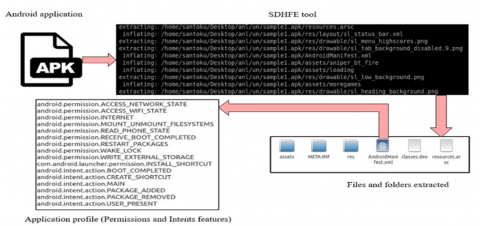 After collecting samples of both malware and benign apps, the researchers utilized the Static Dynamic Hybrid Feature Extraction (SDHFE) tool to reverse engineer and decompile them into their source files. The SDHFE tool is a lightweight and automated tool developed by the authors to analyze Android applications and extract features from them. It operates on the Linux operating system. The SDHFE tool is easy to use, allowing researchers to effortlessly generate profiles from the analyzed applications based on selected features. It can extract permissions and intents from manifest files, APIs and opcodes from source code, and system calls from the application's behavior during execution. Notably, it possesses the capability to efficiently analyze and generate profiles for a bulk of applications without requiring human intervention. Furthermore, researchers can leverage this tool to generate profiles that include features from many sources at the same time, such as generating profiles based on permissions and APIs together. For this study, we utilize this tool to extract static features such as permissions and intents.