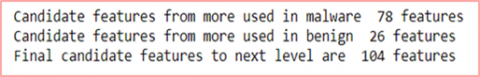 The researcher has performed two functions on the extracted data. The first function scans all profiles generated in the feature extraction phase to collect features and keeps them in a single list called Featurelist. The second function reads the Featurelist and eliminates redundant features from it. The redundant features are either duplicated more than once in the Featurelist or rarely appear in Android samples. The remaining features were saved into a new list called FilterList and appended to the dataset as a header of columns.