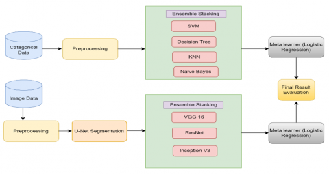 An ensemble stacking model given in Figure 2 is used in the analysis phase of clinical data. Ensemble learning involves the amalgamation of predictions derived from multi ML models applied to the same dataset, employing bagging and boosting etc. Stacking solves the query of selecting a model from multiple proficient machine learning models, each excelling in addressing a problem but in distinct ways. In contrast to bagging, stacking involves using diverse models, such as different types of algorithms (not limited to a single type, like decision trees), and these models are fitted on the same dataset rather than on samples of training dataset. Unlike boosting, where a sequence of models corrects the predictions of earlier ones, stacking employs a single model to learn the optimal way of combining predictions from diverse contributing models on the same dataset. The structure of a stacking model comprises 2 or more base models, commonly denoted as level-0 models, and a meta-model, which integrates those predictions generated by the base model. The training process of the meta-model or level-1 model involves utilizing predictions from base models on out-of-sample data. Specifically, data not employed in training is input into the models to generate predictions. The resulting predictions, and corresponding expected output, constitute dataset input and output pairs for training this meta-model. These outputs can take various forms depending on the nature of the task. For regression tasks, the outputs may be real values, while for classification tasks, they could be probability values, values resembling probabilities, or class labels. The most popular mode to create the training dataset involves k-fold cross-validation of base models, in which meta-model's training dataset is derived from the out-of-fold predictions. Input elements of training data, may also added into the training data, thus providing more context and helping to determine the optimal way to combine its predictions. While base models can be trained on the original training dataset, meta-model can be trained independently once training dataset has been prepared. When several ML models exhibit skills on a dataset but differ in how they demonstrate their skill, stacking becomes appropriate. Base models are frequently intricate and varied. Because of this, it's usually a good idea to use varied models having diverse assumptions about solving the predictive modelling task.