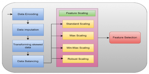 To assess whether data exhibits skewness, distribution curves can be plotted. Skewed data impacts performance by influencing model assumption or complicating analyses of feature importance. Here, 'log1p' transformation was employed for dealing with skewness of data. This particular transformation effectively mitigates skewness, helping to balance the distribution curve. Feature scaling was done to standardize independent features within the dataset to a specific range. It plays a crucial role in managing data with widely varying values. When a dataset isn't scaled, machine learning models may inadvertently assign higher importance to larger values and lower importance to smaller values, irrespective of their actual significance. Hence, various feature scaling methods like Min-max normalization, Maximum absolute scaling and Standardization were used. For selecting features, univariate selection techniques like Chi-squared test and F-test were done.