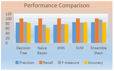 Two tests are used in our comparison: Friedman and Nemenyi tests. The first test is Friedman, and if H0 is rejected, we will use Nemenyi test to determine which classifier is optimal. In this case, there are five classifiers: Naïve Bayes, KNN, SVM, Decision tree and Ensemble stacked model. Friedman test is conducted by choosing the 4 parameters: Precision, Recall, Accuracy and F-measure. The Q-value is obtained as 7.85. The table value obtained is 3.25. Since this value is less than the observed value, Ho is rejected. So Nemenyi test is conducted. We must determine the difference between each classifier's mean rankings (average row in the ranking table) when performing the Nemenyi test (comparing pairs of classifiers). This difference indicates a significant difference between the two classifiers if it is larger than or equal to a CD (critic distance). Ensemble stack model and SVM found a difference that was greater than CD, indicating a significant difference between them and the superiority of ensemble stack over SVM is thus established.