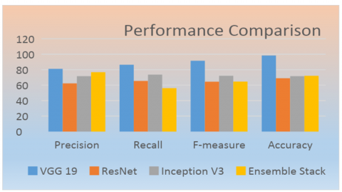 Performances of deep learning model and stacked ensemble model are given in Table 2 & graphical representation is shown in Figure 9. The given accuracies show that the VGG 19 shows optimum performance in comparison with other classification models.