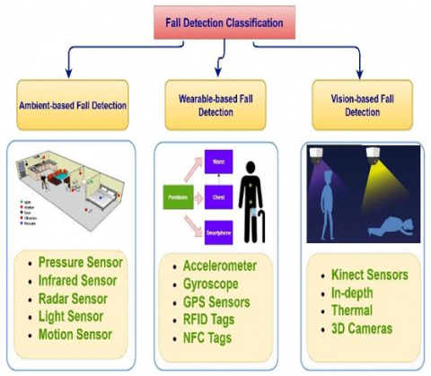 Figure 1. A representation of various ambient-based, wearable-based and vision-based fall detection methodologies