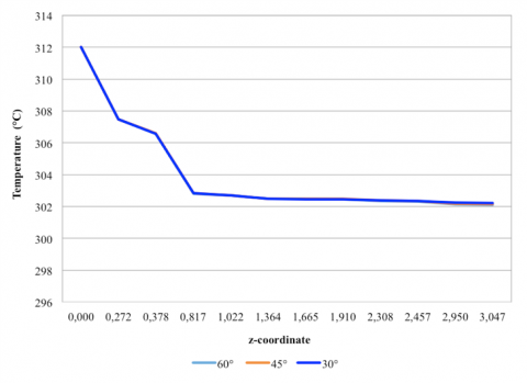 The influence of the spray cone angle is investigated by comparing the results for different half-cone angles, 30°, 45° and 60°. Cooling efficiencies, average air temperatures and humidity in “Plane_0.9” has been calculated for air velocity of 5.96 m/s and nozzle arrangement 4, and are reported in Table 9. The influence of spray cone angle is negligible, as confirmed by the results shown in Figure 14.
