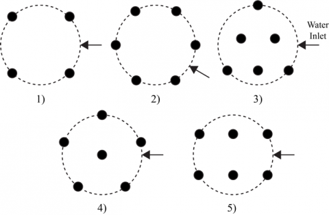 (1) Considering the nozzle arrangement reported in Figure 5, the best configuration is the number 4, because of its impact on the spray coverage area. Cooling efficiency value range is from 71 % to 65 % for the worst arrangement, the number 1. For the other configurations, values are very closer, 69 % for arrangements 2 and 3 and 68 % for arrangement 5. The final air temperature varies from 304.2 K for arrangement 1, to 303.4 K for arrangement 4. In the better case the temperature drop is equal to 8.6 K.