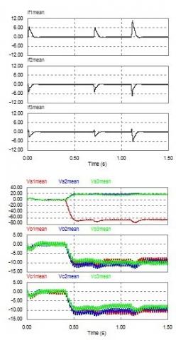 Figure 4.3 Phase currents and bridges output voltages mean values in T11 open fault condition at t=0.4s