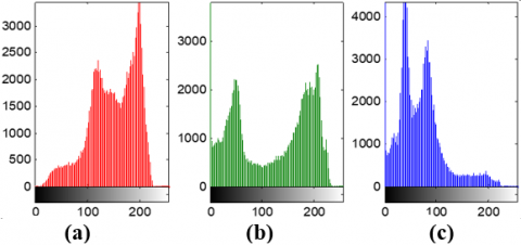 Figure 8. Histograms of the three plan color of the original image: (a): Red, (b): Green, (c): Blue