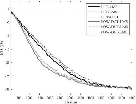 In this section, we evaluate the performances of the proposed POW-TDLMS algorithm by comparing it to that of the conventional TDLMS algorithm for the DCT, DFT and DHT transforms. The corresponding algorithms are the DCT-LMS, DFT-LMS, DHT-LMS for the conventional TDLMS and the POW-DCT-LMS, POW-DFT-LMS, POW-DHT-LMS for the proposed POW-TDLMS. The step size parameter of the adaptive post whitening is set $y=0.001$ for all the experiments and all the simulations are averaged over 100 independents runs.