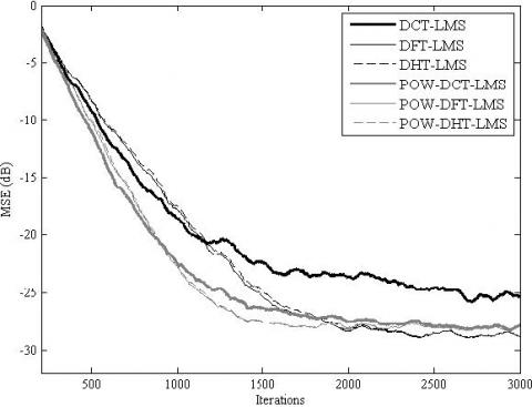 It is clear from Table 1 that the proposed POW-TDLMS algorithm significantly decreases the eigenvalue spreads, which approaches to 1 for various transforms, independently of the correlation level of the input signal. Consequently, the post whitened signal becomes nearly white and the proposed POW-TDLMS algorithm should provide better MSE convergence behavior compared to the conventional TDLMS algorithm.