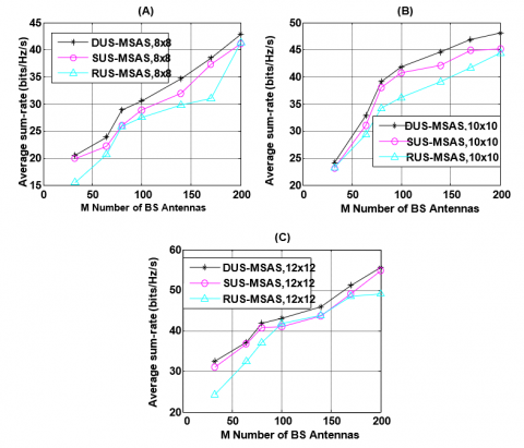 Figure 6. Average sum-rate vs. N for DUS-MSAS, SUS-MSAS, and RUS-MSAS, (A) 8×8, (B) 10×10, (C) 12×12 configuration, with fixed M=64 and SNR=25dBm