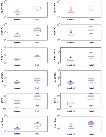 In this paper, we proposed novel non-linear geometrical features in order to discrimination of EEG signals in two classification tasks, including: normal vs. ictal (i.e. AB vs. E) and interictal vs. ictal (i.e. CD vs. E). P-value evaluates the ability of features in order to discriminate between the two classes [3]. In the present study, Kruskal–Wallis statistical test is applied to p-value computation [3, 15-19, 22, 24, 28, 30]. The kruskalwallis function in MATLAB is used for p-value computation. Features with less than 0.001 the p-value can be considered as clinically significant features in designing a Computer-aided diagnosis system [31-33]. In other word, lesser p-value indicates to better ability of features in the discrimination of groups [3, 16, 30]. In this work, we computed the p-values for normal vs. ictal and interictal vs. ictal groups. Also, the box plot is employed in showing the minimum, first quartile, median, third quartile, and maximum values of the extracted features. The mean and standard deviation of features are written in the Table 1 and resulted p-values are written in the Table 2. Also, box plots of features are shown in Figure 10.