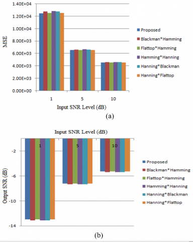 Figure 10. Comparison of MSE(mV) and output SNR(dB) by varying input SNR levels for different hybrid windowing functions
