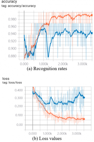 Once the weights obeyed truncated normal distribution, the improved DCGAN was trained and tested. Figure 9 compares the recognition rates between the training set and the test set after 3,500 iterations. Figure 10 compares the loss values between the two sets. In both figures, the curve of the training set is in red and that of the test set is in blue. Obviously, the improved DCGAN started to converge at around 750 iterations. The recognition rates of the training set and the test set were both around 99%, while the losses of the two sets were very low (<0.001).