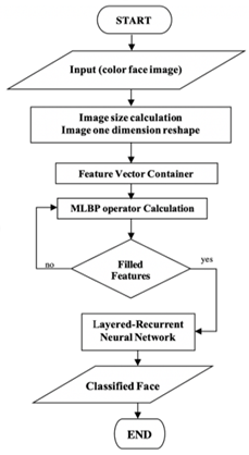 The proposed hybrid method relies on merging MLBP and LRNN as shown in Figure 1. The proposed algorithm is composed of three key sections: firstly; a pre-processing phase which consists of face image resizing and reshaping from three dimensional matrixes into one raw vector. Secondly; applying MLBP operator on reshaped face image which extracted the features of each face image and adding these features in one raw matrix. This features data base matrix contains all features of face images in the sense that each image represented by four features. Finally, LRNN is constructed to train and classify the extracted features.