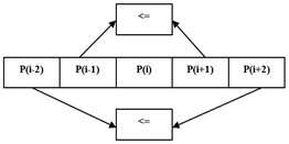 The extraction of features is a mechanism of dimension reduction which reduces the initial set of data toward more convenient parts for processing. In this manner treating color images was on the way of reshaping color image matrix into vector shape or one dimensional array, i.e. image with size (x1, x2, x3) a 3D image to be resized into x1 by x2 by x3 production then reshaping a 3d matrix into 1d, this initialization step to use benefits of computation time reduction. Thus, previous steps were a construction preparation for feature extraction using modified local binary pattern approach (MLBP) which is pre-locating version of local binary pattern method [29], local binary pattern (LBP) [7, 30-32] is a strong local descriptor since it can efficiently represent the structural information of an input image to produce unique local features. A proposed approach used pixel intensity location comparison on 4 neighbors of pixel intensity values (i-1, i+1, i-2, i+2) as shown in Figure 2.