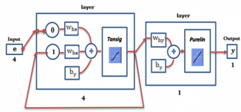 It can be shown from Figure 3 that the L-RNN consists of an input layer, a hidden layer, an output layer, and one supplementary background layer where the feedback output from the hidden layer have returned to hidden layer. The tangent sigmoid function (Eq. (1)) is activated in the hidden layer and the linear transfer activation function (Eq. (2)) is used at output layer.