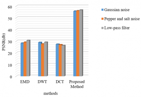 In this section, we compare the proposed method to other techniques including DWT [5], EMD [6], and DCT [8] methods. The comparison is performed on input images of a and b in Figure 3. Table 5 compares the values for PSNR and NC in the proposed method with other methods with respect to different attacks. Also, in Figures 8 and 9, we compare the proposed PNSR and NC with other methods.