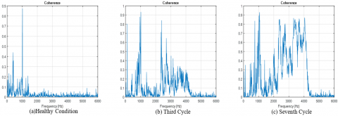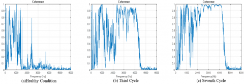 Authors have presented a KF fusion study with current signals [41]. The SV is executed using statistical analysis while FD is done through the spectral analysis. The current signal’s deterministic nature does not permit any further interpretation like aging or the determination of health status for the system. However, in this study, through the stochastic nature of vibration signals, Kalman algorithm provides more information to use different tools. Statistical, spectral investigations are supported with coherences to succeed SV and FD. Additionally, discrimination of process problems and aging becomes possible by the defining a rate representing healthiness.