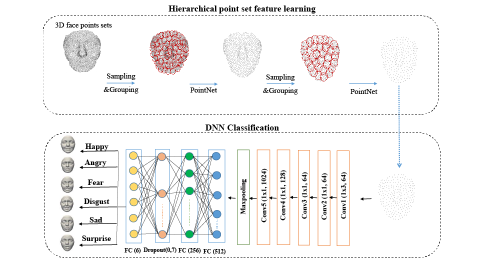Nowadays, Deep Learning (DL) has become the basis of most state-of-the-art techniques used in the machine learning field. Motivated by the high inference achievement demonstrated by Deep Neural Network (DNN) architectures, recent FER approaches have employed DNNs to classify FEs. Promising results in terms of FER accuracy have been achieved [5-8]. Most of the previous work on 3D FER has focused on transforming 3D faces into 2D representations in order to allow for a straightforward use of CNN-based architectures. However, such representations induce resolution-degradation and information-loss problems. Therefore, previous 3D FER approaches remain suboptimal and unable to fully describe subtle and complex details of shape cues.
