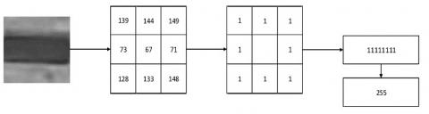The idea of the LBP is to describe the variation in image texture by reporting the pixel value at a specific position and the pixel values of the region near that position. In a 3×3 window, the pixel value at the positive center pixel (x, y) is taken as the threshold, and the pixel value of (x, y) is compared with that of every other pixel (starting from (x-1, y)) in counterclockwise direction. If the other pixel is greater than the center pixel, the comparison result is recorded as 1; otherwise, it is recorded as 0. This operation generates an 8-bit binary code, which will be converted into decimal number. This number is the value of the LBP feature at (x, y), which reflects the texture variation of the image: