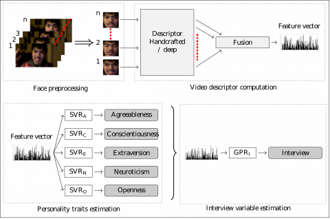 In our work, six steps are performed to obtain the interview score, which are: (i) face preprocessing, where the detected faces are aligned and cropped, (ii) feature extraction, where a set of features for each face is extracted, (iii) video descriptor computation, where the features of each video are computed by taking the mean of all face feature vectors, (iv) feature selection, where a non-parametric feature selection method is applied to exclude possible irrelevant features, (v) personality traits estimation, and (vi) interview variable estimation. Figure 1 illustrates the general structure of our approach.