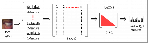 where, each descriptor in the dimensional feature image has been fed by a grayscale image which results to 19 2D arrays as follows: x and y are the pixel location, I is the intensity, Ix,Iy,Ixx,Iyy are the first and second spatial intensity derivatives, LDP(k) is LDP image obtained for a given k={3,5,7} most prominent directions, BSIF(f) is BSIF image obtained for a given texture filter of size f={9´9,11´11,13´13} and 8bit length, LPQ(ws) is LPQ image obtained for a given window size ws={7,9,11}, and finally LBP(r,n) is LBP image obtained for a given radius r={1,2} and number of neighboring points n={8, 16}, since the number of channels used is 19 then the COV descriptor for each region is described by D=d´(d+1)/2=190 features. And the total number of features for the whole image is B´D=140´190, where B is the total number of blocks, D is the image descriptor size in each block.