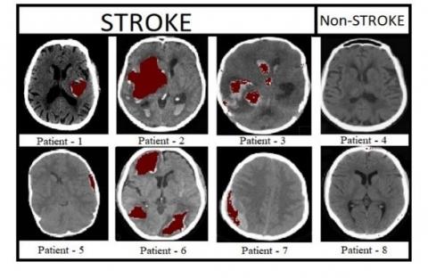 Figure 9 shows the pre-processed brain CT images of 8 patients, in which 6 patients are affected with stroke and remaining 2 are non-stroke patients. Figure 10 shows the labeled brain CT images of 8 patients. These labeled images contain three classes represented with white, gray, and black colors. Patients 4&8 are not affected with stroke, so these images are labeled with only two classes. The images shown in Figure 11 are predicted by our proposed model. Figure 12 shows output images of our proposed stroke segmentation on brain CT images.