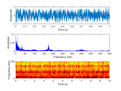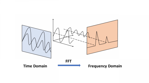 where, $e^{\frac{i 2 \pi}{N}}$ is a primitive Nth root of 1. Direct evaluation according to this definition requires O $\left(N^{2}\right)$ operations: $X_{k}$ has a total of N outputs, and each output requires N sums. Direct use of DFT operation requires the use of N complex multiplications (4N real number multiplications) and N-1 complex number additions (2N-2 real number additions), therefore, calculation of all N points using DFT requires N2 complex multiplication and N2-N complex addition. FFT is a method that can calculate the same result in O (N log N) operations. Figure 1 shows how FFT transform time domain into frequency domain.