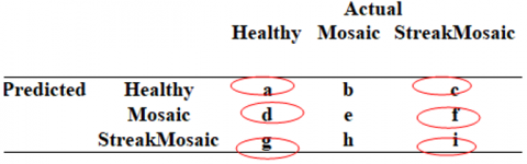 and sensitivity for a multi class problem is calculated for each and every category. In this work, the sensitivity for healthy leaves, mosaic leaves and streak mosaic diseased leaves are calculated as follows.