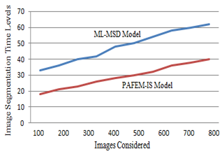 Segmentation is a discipline of image processing that focuses on splitting a picture into various sections based on the qualities and properties of the individual components [30]. Picture segmentation is the process of dividing an image into different segments that share comparable characteristics [31]. Image Objects are the sections of the image into which the image is divided. The proposed model takes less time to segment the image. The image segmentation time levels of the proposed and traditional models are shown in Figure 5.