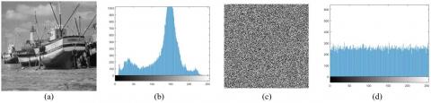 Figure 8. Histogram results of Lena’s image. (a) Lena image, (b) histogram of Lena image, (c) encrypted Lena image, and (d) histogram of encrypted Lena image