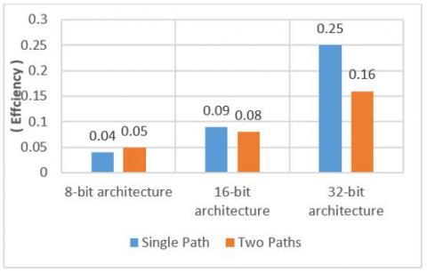 The 32-bit single-path architecture achieves higher throughput and efficiency compared to the 16-bit single-path architecture. However, it requires more hardware resources than the 16-bit architecture.