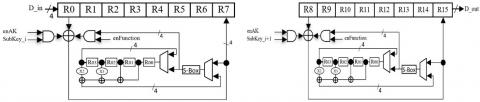 In the proposed design, the F function architecture is based on only one S-Box layer (i.e., four S-Box) instead of 8 [8], two multiplexers and 16-bit registers as shown in Figure 2 and Figure 3, which respectively represent the single path block cipher 8-bit architecture and 16-bit architecture.