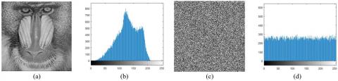 Figure 9. Histogram results of Baboon image. (a) Baboon image, (b) histogram of Baboon image, (c) encrypted Baboon image, and (d) histogram of encrypted Baboon image