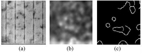 Figure 6. (a) Original image of the PV panel, (b) Gabor image of the PV panel and (c) edge image of the PV panel