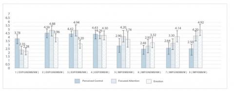 Moreover, significant interaction effect was found between embellished visual feedback and no embellished visual feedback on attention (F=12.593, P = 0.000 < 0.01). The salience and music have a significant interaction impact on users' perceived control (F=21.599, P=0.000<0.01), focused attention (F=12.593, P=0.000<0.01), and emotion (F=9.324, P=0.003<0.01). Moreover, the embellishment and music show a significant effect on perceived control (F=25.992, P=0.00<0.01) and focused attention (F=283.286, P=0.000<0.01).