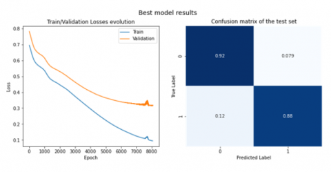 The best training model with hyper-parameters and the best F1 score are as shown in Table 2, graphical representation and confusion matrix as shown in Figure 13. The Confusion Matrix highlights that the best prediction accuracy attains at 88%. The best model has accuracy of 92% is shown in Figure 14 The train and validation losses evolution are measured using Loss Vs. Epochs.