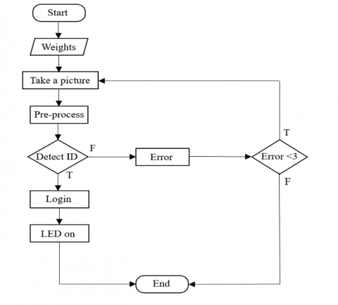 The system architecture in this study is divided into two parts. The first part is the training phase. The finger vein images captured by the night vision lens are used for image processing. After image processing, a database will be established. The content of the database includes the position coordinates of the finger vein bounding box in the picture and the category name to which it belongs. After YOLO training, the position information from the finger vein bounding box and the object category in the rectangular box can be obtained. The information will become the YOLO weight file needed for testing as shown in Figure 7. The second part is the testing phase. When the system is turned on, the weight file will be imported. After the finger is placed in the designated area, the night vision lens will be used to take an image of the finger vein and the image will be processed. After the image processing is completed, the image will be input to Yolo for identification. If the driver who has already established data in the database is judged, then “Login” will be displayed and the LED will be on. If the driver identification result is not in the database will display "Error" and enter the next judgment stage. If the error is less than three times, the system will return to the photographing stage to perform image preprocessing and identity recognition again. On the contrary, it will be judged as an error and the system will be shut down as shown in Figure 8.