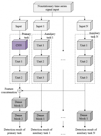 Confusion can easily result from non-stationary time series signals whose distribution law is time-dependent. In order to recognize non-stationary time series signals defined by significant chaotic classes, this paper introduces multi-task learning. In this study, the network that can discriminate between two non-stationary time series signals is employed for auxiliary classification tasks, with the multi-task learning network's primary task being the identification of all non-stationary time series signals. On this basis, this paper connects gated recurrent unit (GRU), responsible for the auxiliary tasks, with convolutional neural network (CNN), responsible for the primary task, in series into a model (Figure 3).