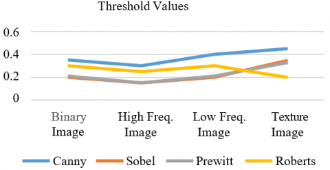 Figure 2 shows that the highest threshold values were with the Canny edge detection algorithm, and in the case of the texture input image, the threshold values obtained in all types of edge detection algorithms are high compared to other types of images. Edge determination is used the Canny algorithm, which has several working steps that make it different from the rest of the other algorithms. The steps are noise reduction, gradient computation, non-maximum suppression, use of two thresholds, and edge tracking. These steps, in particular the step of using two thresholds, make the threshold values slightly larger than the rest of the algorithms, arguably starting from 0.3.