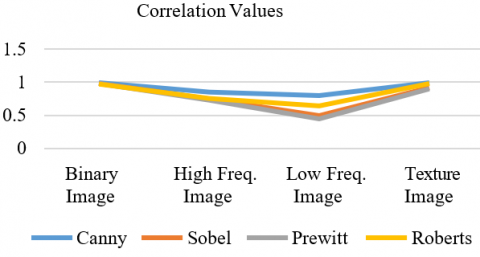The above Table 4 and Figure 5 clearly show the highest correlation values with the Canny edge detection in all types of images. Moreover, as it is known that the correlation values are between - 1 and 1, whenever the value is close to 1, the correlation is very strong, and if the value is 0, there is no correlation, and in the case of a -1, that means they are opposite.