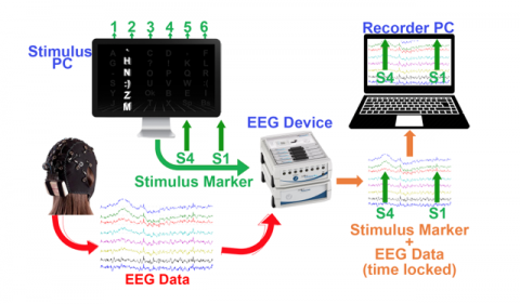 The data collection setup consists of two separate computers, one for visual stimulus presentation, another for data recording, and an EEG device by which brain responses are measured during visual stimulus presentation. Here, stimulus presentation is performed using MATLAB software. The index information of flashed row or column and the obtained brain electrical activity detected on the electrodes are combined by the EEG device and sent to the recording computer. Thus, EEG data and visual stimulus index are recorded with a time lock. This data collection setup is shown in Figure 5.